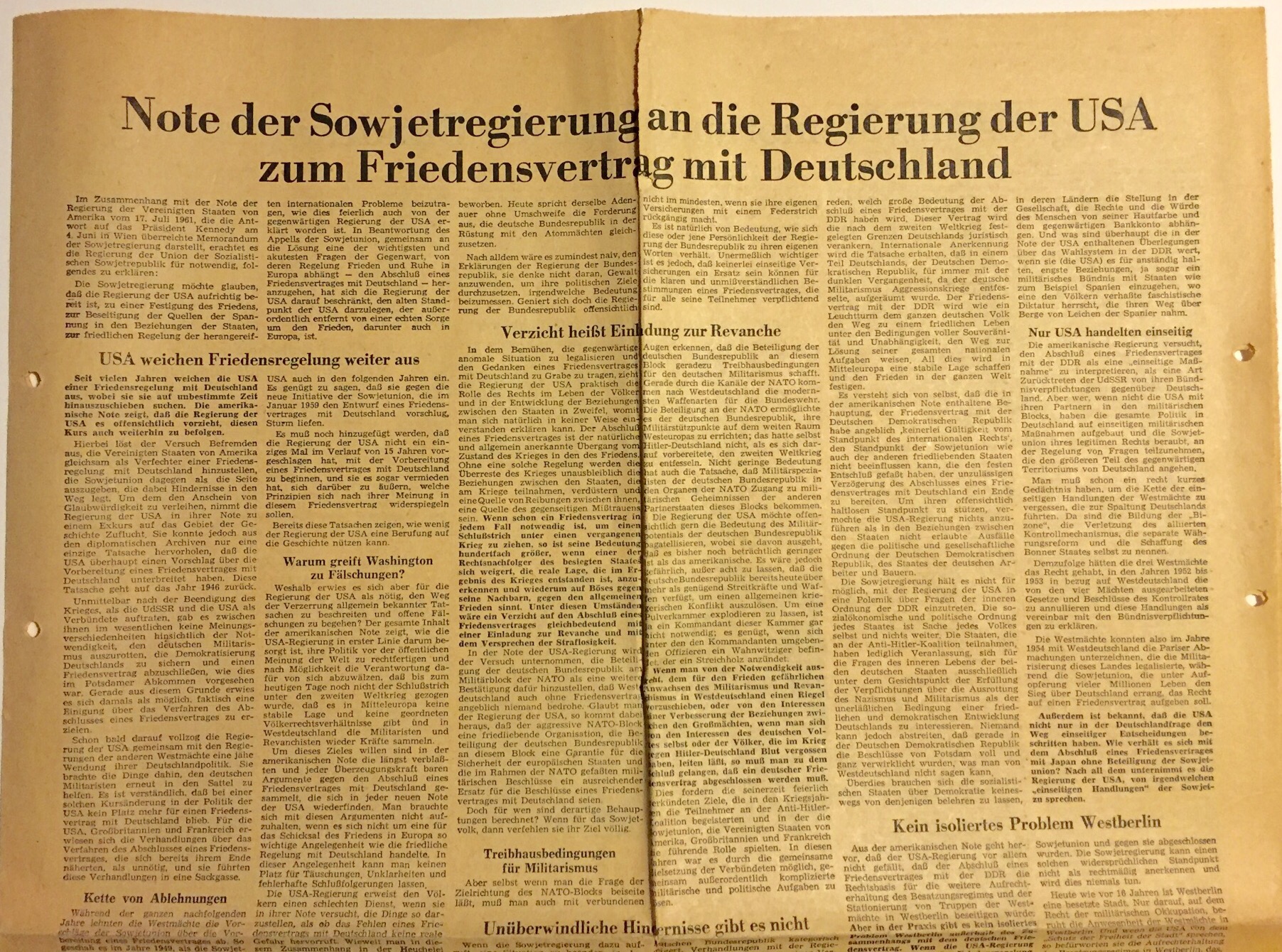 Die amerikanische Regierung versucht, den Abschluß eines Friedensvertrages mit der DDR als eine „einseitige Maßnahme“ zu interpretieren, als eine Art Zurücktreten der UdSSR von ihren Bündnisverpflichtungen gegenüber Deutschland. Aber wer, wenn nicht die USA mit ihren Partnern in den militärischen Blocks, haben die gesamte Politik in Deutschland auf einseitigen militärischen Maßnahmen aufgebaut und die Sowjetunion ihres legitimen Rechts beraubt, an der Regelung von Fragen teilzunehmen, die den größeren Teil des gegenwärtigen Territoriums von Deutschland angehen.