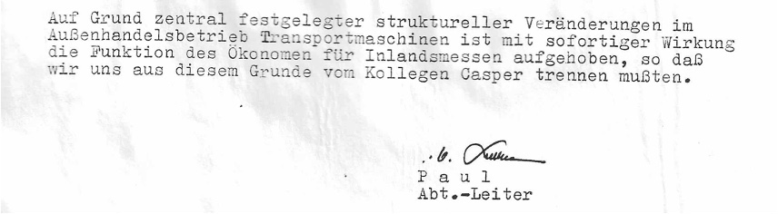 „Im Ganzen ist dies eine schwierige Situation, in welcher sich die DDR z.Zt. befindet. Meiner Meinung nach muss Wert auf Stimulis gelegt werden. Aber auch administrative Maßnahmen gegen die Nichtauslastung von Arbeitszeiten bringen uns voran. Wir müssen unsere innere Ruhe überwinden.“