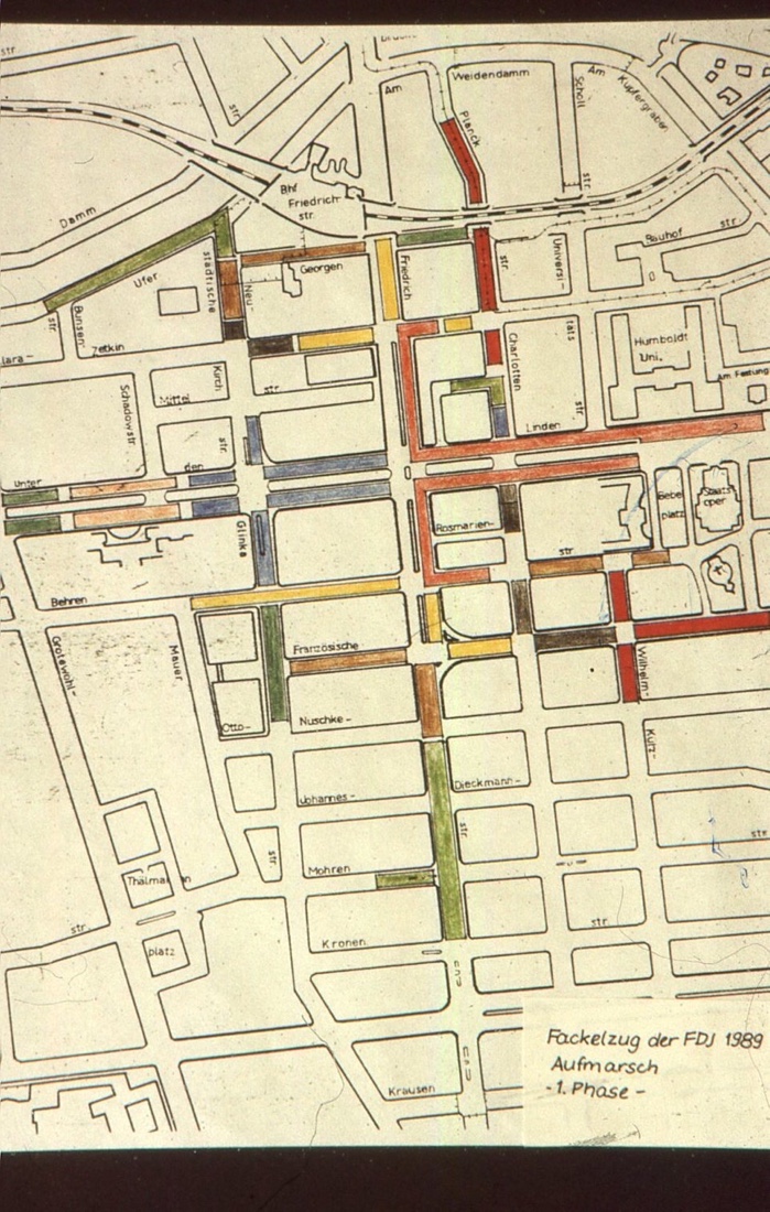 An diesem Tag nun sollte der große Fackelzug der FDJ stattfinden. Wir haben diesen im Rahmen unserer Tätigkeit seit dem Sommer vorbereitet. Im alten Brechthaus in der Chausseestr. 123 war die Außenstelle der Bezirksleitung für diese Dinge untergebracht.