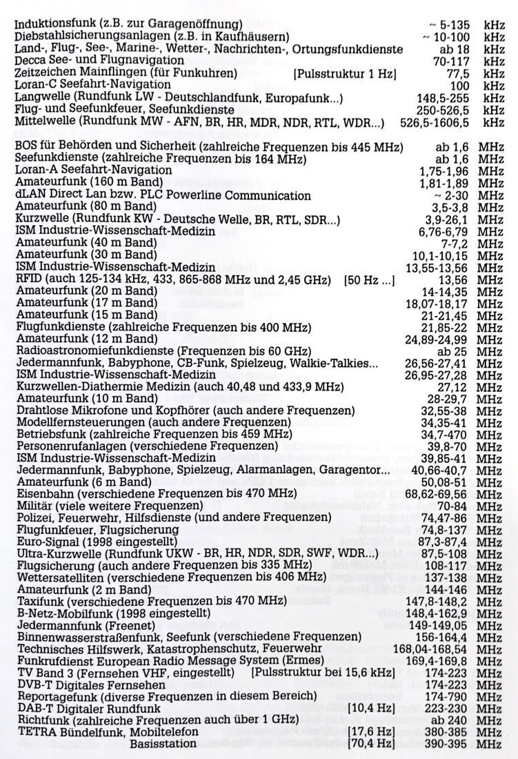 Frequenzbereich von 9 kHz – 800 MHz – hauptsächlich zur Übertragung von analogen Radio und Fernsehprogrammen senden ungepulste Signale. Neue Techniken zur digitalen Signalübertragung wie Mobilfunk, Heimtelefone und Computer-Funknetzwerke nutzen die Frequenzen von 900 MHz und 5,7 GHz. Diese senden mit Ausnahme der CT1+ Technik (alte Generation von Schnurlostelefonen) gepulste Signale. Radaranlagen arbeiten im Frequenzbereich ab ca. 1,5 GHz bis über 100 GHz gleichfalls mit gepulster Strahlung.