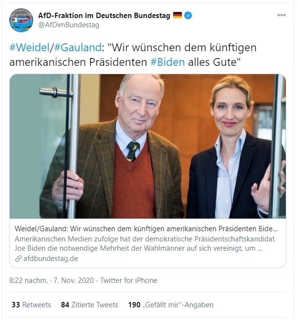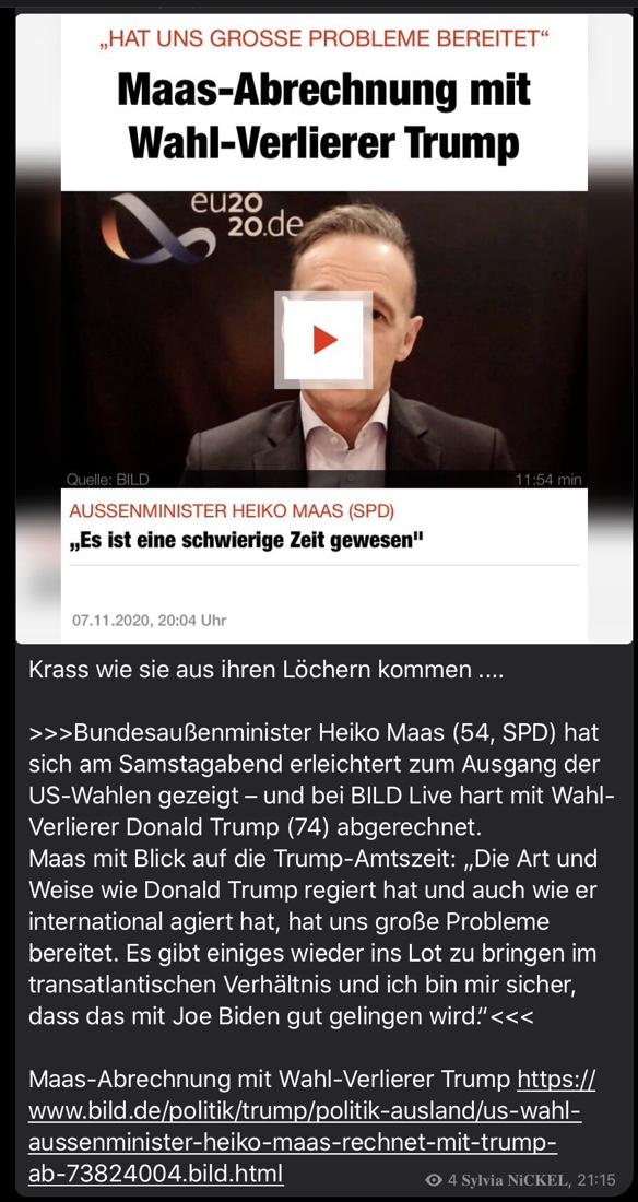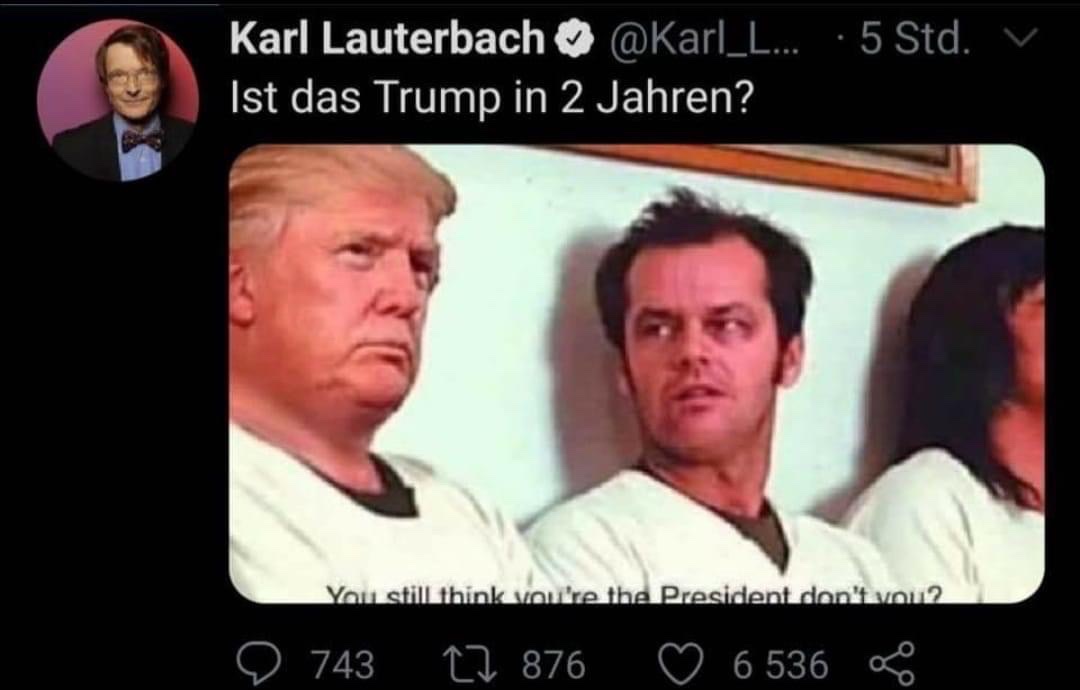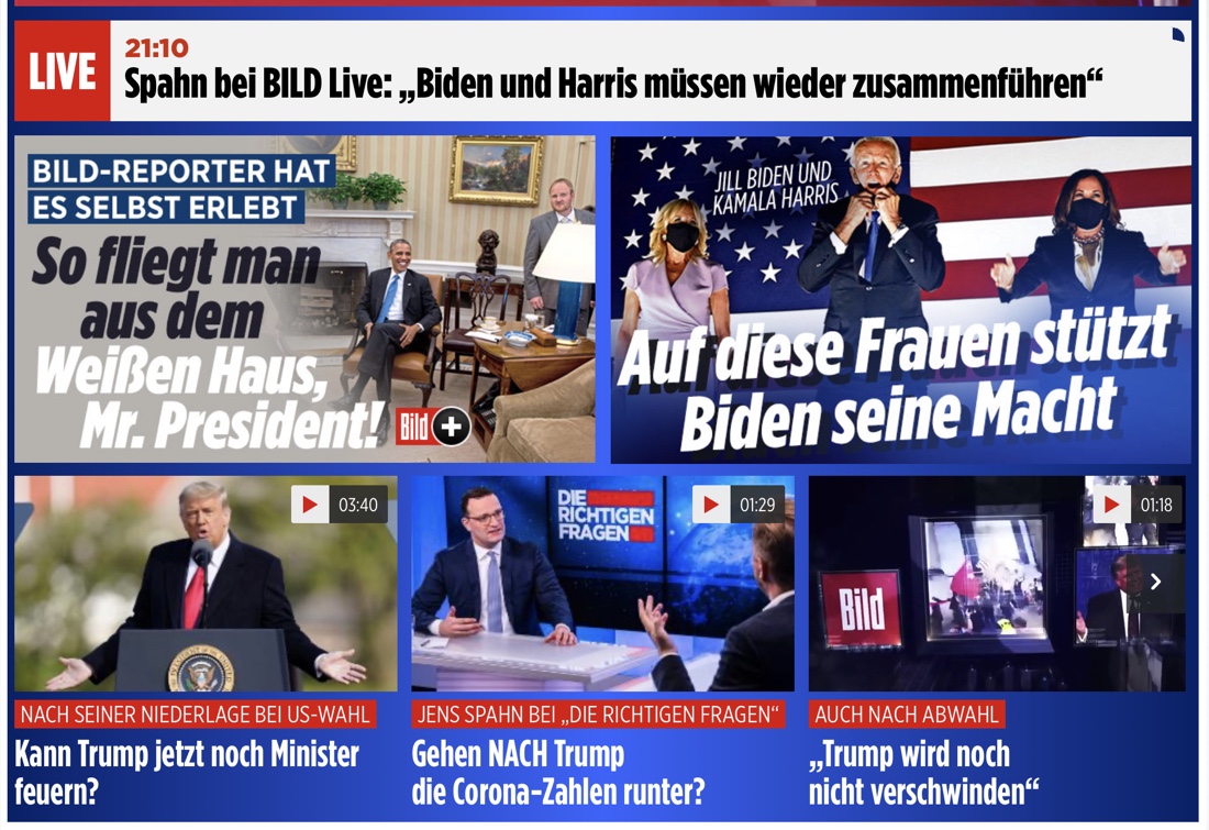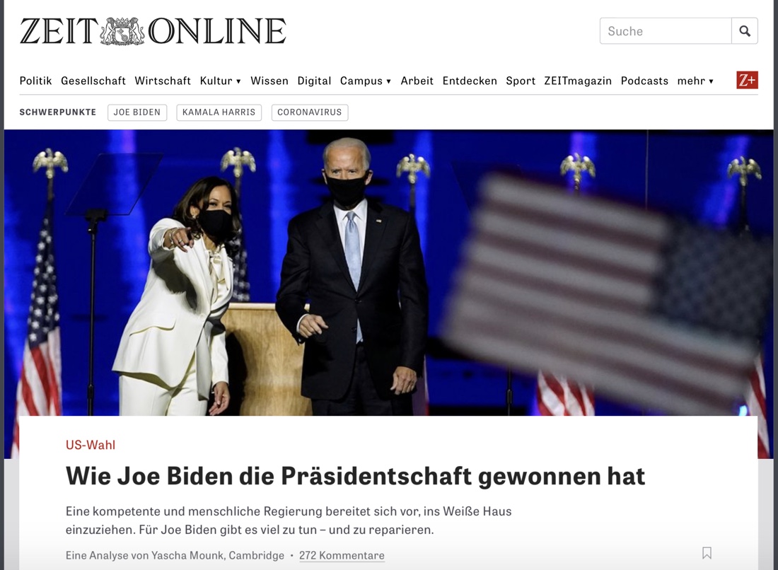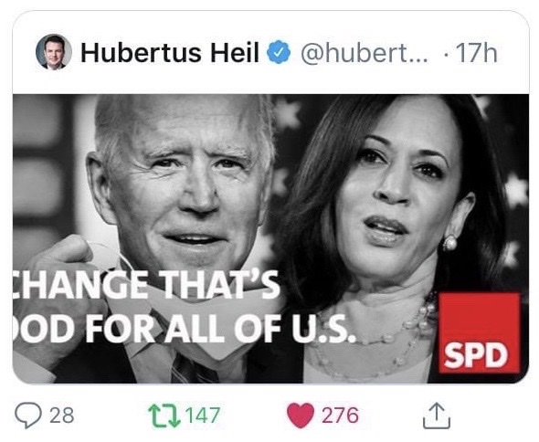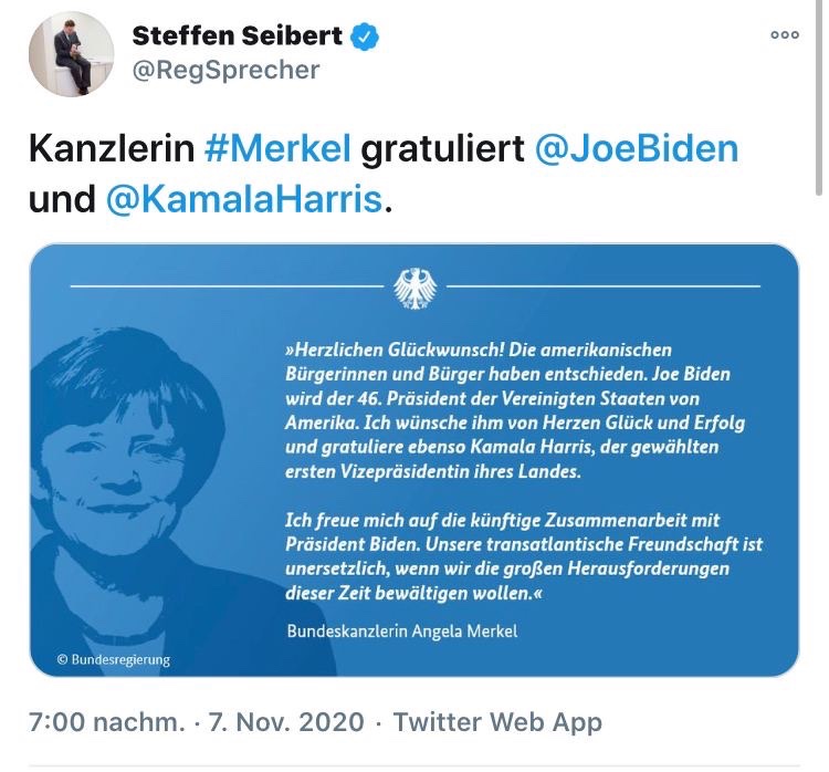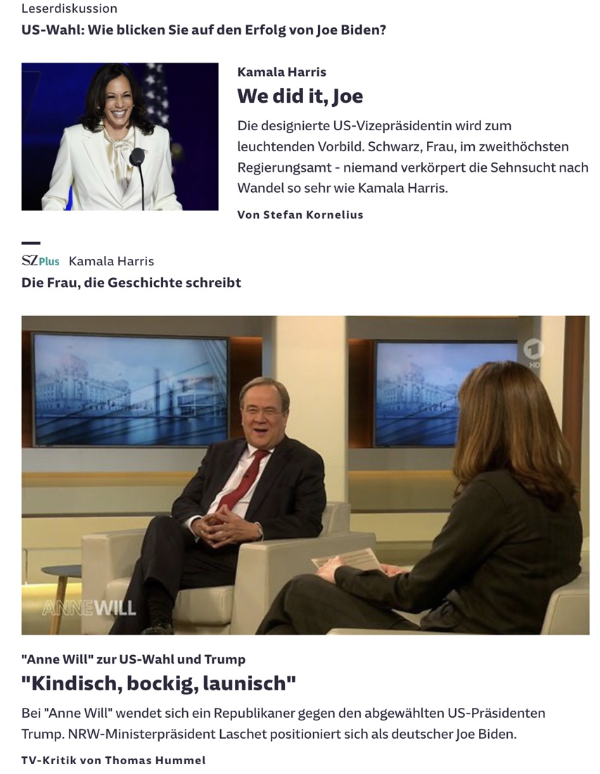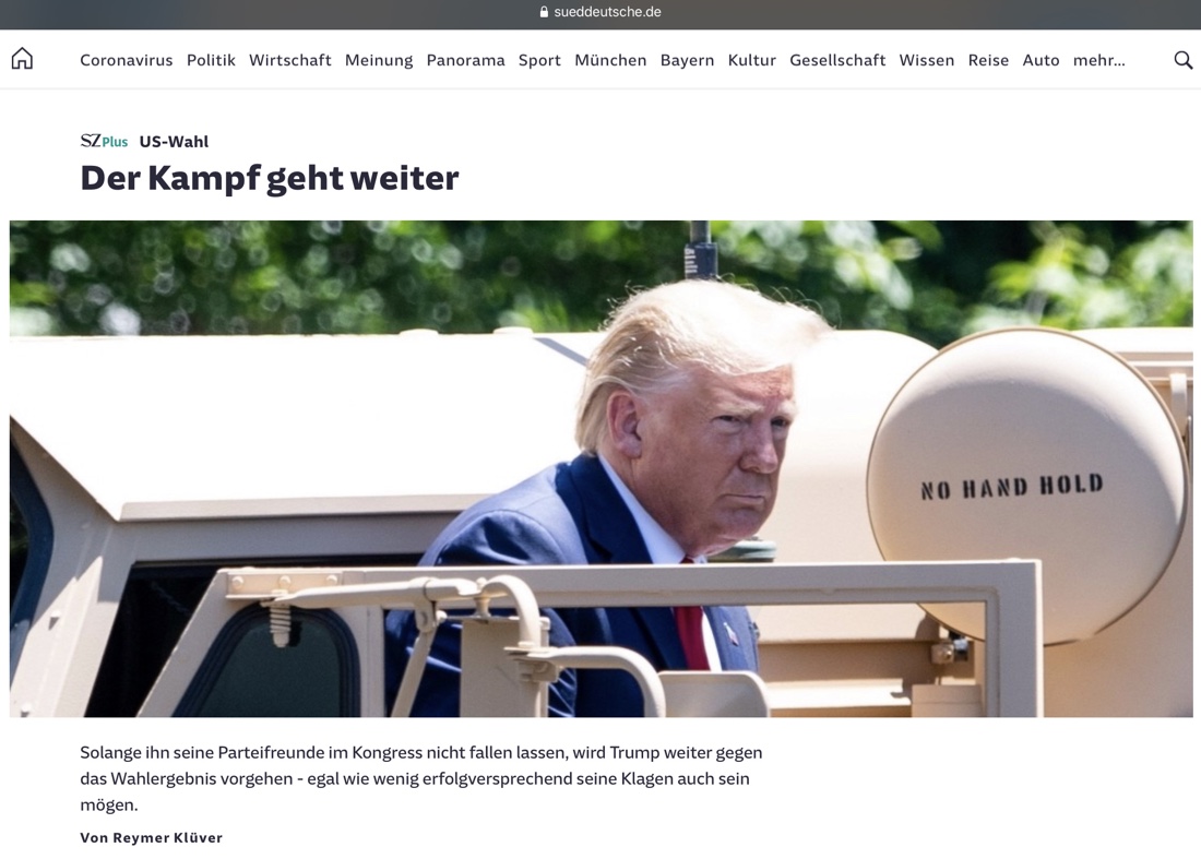 Der Deutungsrahmen lässt kaum Kritik am Ergebnis zu. Die Information ist Alternativlos. Das Trump-Bashing geht in die finale Phase.Für die ganz Bekloppten gibt es noch ein Sahnehäubchen für den Friseurbesuch mit Maske. Auch die „Zeit“ lässt keine Fragen zu und zementiert medial die Wahl als unumstößlich.Als Wunschdenken verbreitet sie zudem einen Einbruch bei Einschaltquoten, klare Mehrheiten demokratischen Ursprungs und ein wenig Tellerwäschermillionärs-Story.Auch der schöne Karl beglückt seine Follower mit hoffnungsvollen Aussichten.Die SPD mit windigen Euphoriefetzen. Die AfD als angeblicher Schrittmacher, jedoch auch nur im Gleichschritt Ohne Worte. Medienhäuser rufen Präsidenten aus und „Die Grünen“ nennen das „befreiend“. Wem es besonders wichtig war, der twittert sich die Finger wund vor Erregung…Raute.Maaslose Raute.Die „Süddeutsche Zeitung“ versucht sich als Reporter. Sie zeigt den offensichtlich aussichtslosen Kampf des gestürzten Präsidenten…… der bitteschön schon vor dem letzten Arbeitstag die Amtsgeschäfte übergeben soll. Eine euphorische Menge triumphiert die gewonnene Freiheit. Ganz das Gegenteil noch vor einer Woche die Ausschreitungen rund um „BLM“ und die von den Demokraten ins Spiel finanzierte „ANTIFA“ Auch hier Sehnsucht, Erlösung, Freude in den Gesichtern. Wer wird das schon kritisieren wollen?Auch hier gibts was für die total Bescheuerten: Jill als „First-Lady“, aufgebrezelt – die neue „Camilla“. Brrr… Joe, ein wahrer Präsident… Dazu ein „Hoffen“ und, damit es gar nicht vergessen wird, die unumkehrbare Stimmenauszählung. Ganz demokratisch.