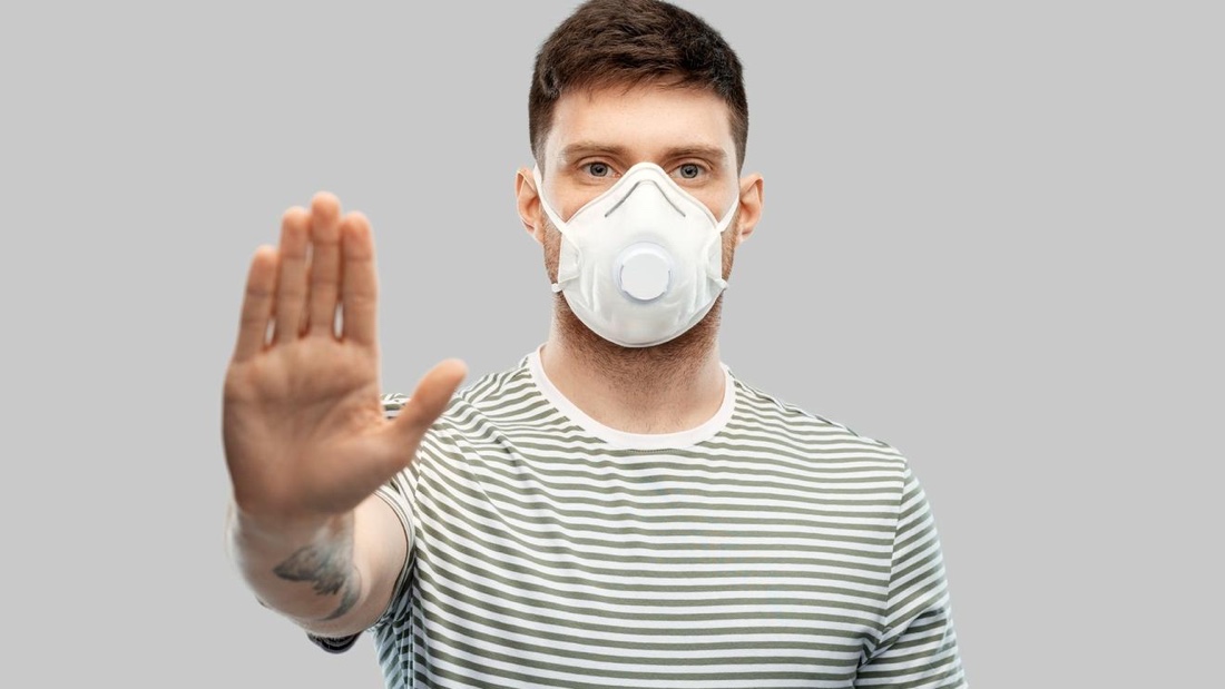 Worried woman wearing protective mask showing smart phone blank screen in the street