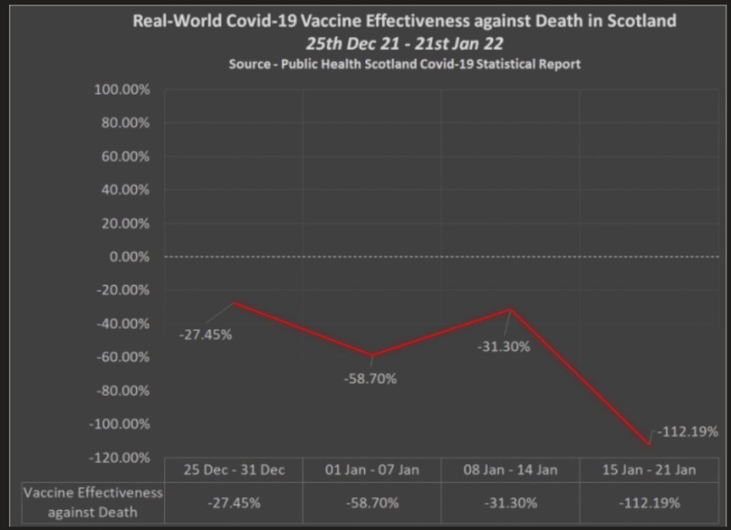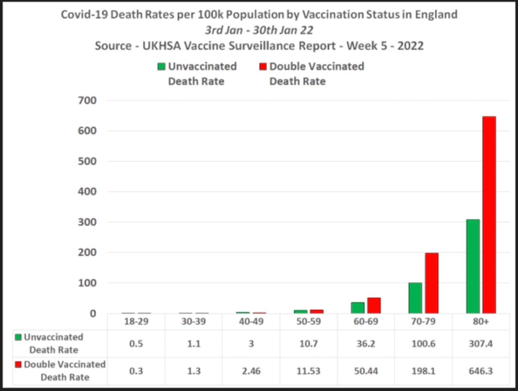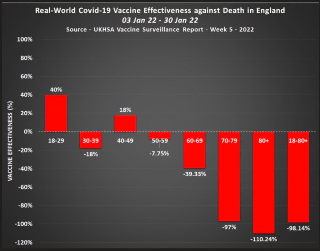 Die tatsächliche Wirksamkeit des Covid-19-Impfstoffs gegen Todesfälle in England zwischen dem 3. Januar und dem 30. Januar 22 betrug nur -110,24 % bei den über 80-Jährigen, -97 % bei Menschen im Alter von 70 bis 79 Jahren und -98,14 % im Durchschnitt bei allen Erwachsenen darüber Alter 18.