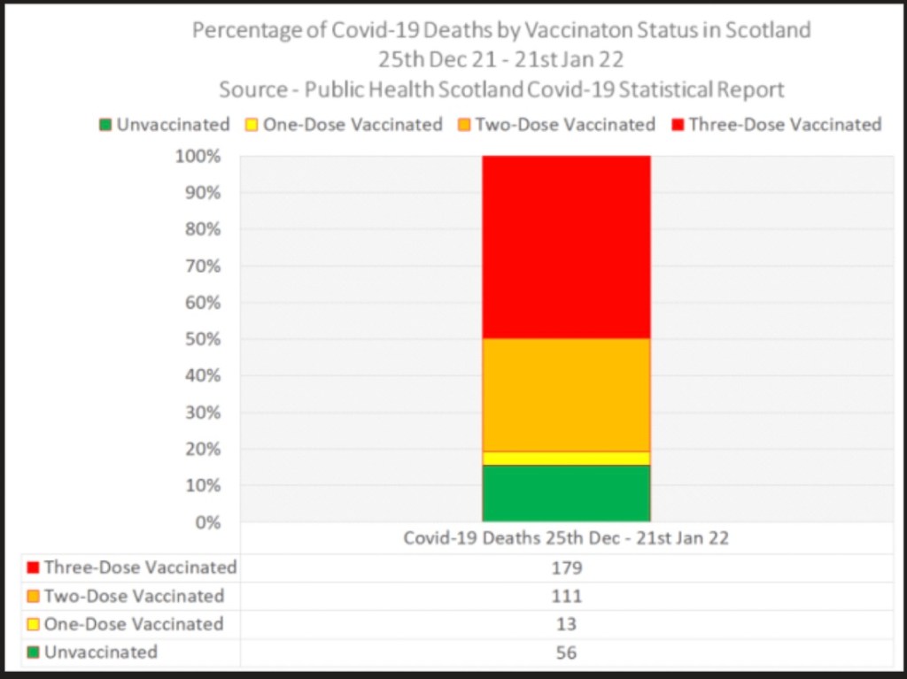 Die folgende Grafik zeigt den Prozentsatz der Covid-19-Todesfälle nach Impfstatus in Schottland zwischen dem 25. Dezember 21 und dem 21. Januar 22, gemäß dem Bericht, den sie am Mittwoch, den 2. Februar veröffentlicht haben: