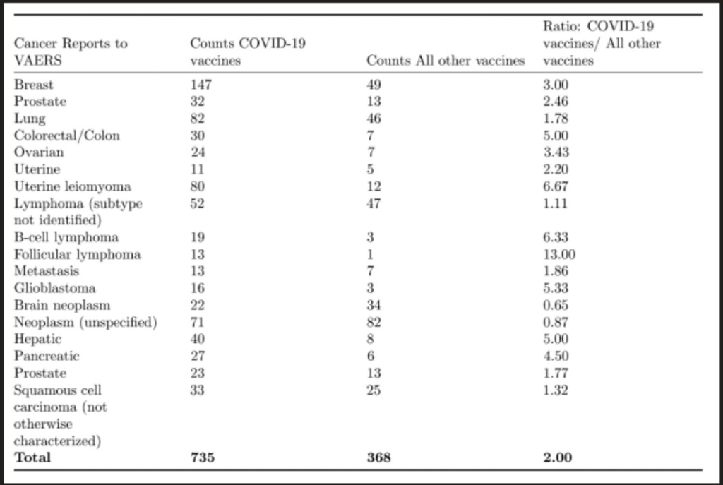 Die folgende Tabelle aus der Studie in Anlage L zeigt die Anzahl der Ereignisse in der VAERS-Datenbank von 1990 bis zum 12. Dezember 2021, bei denen mehrere Begriffe, die auf Krebs hinweisen, im Zusammenhang mit dem Covid-19-Impfstoff oder mit allen anderen verfügbaren Impfstoffen aufgetreten sind, zusammen mit dem Verhältnis zwischen den beiden Zählungen.