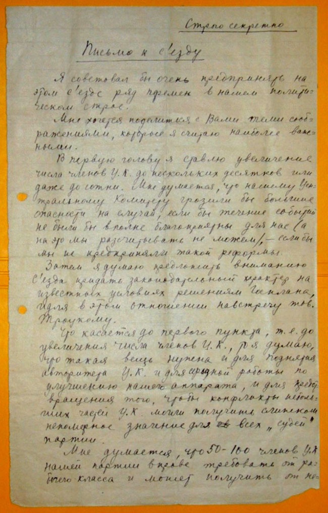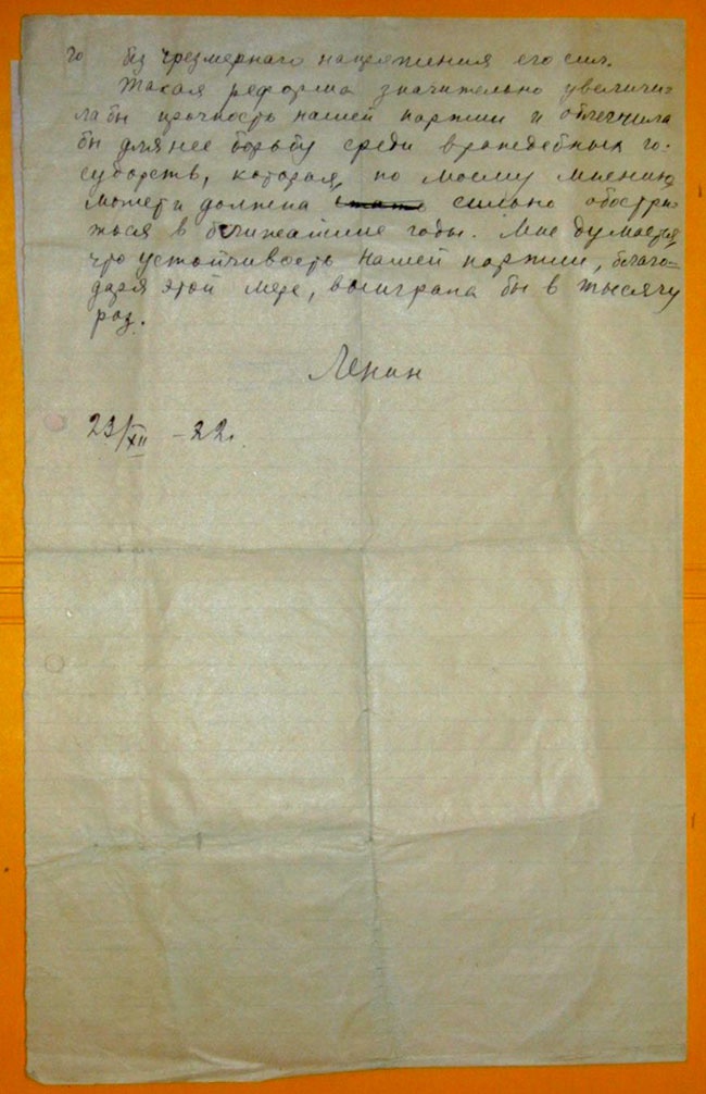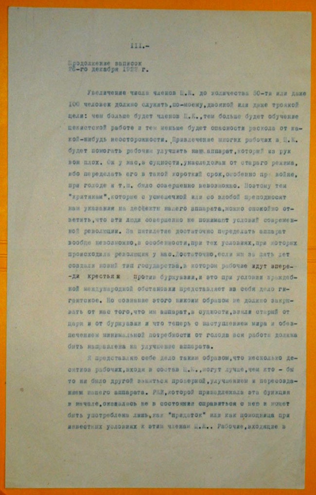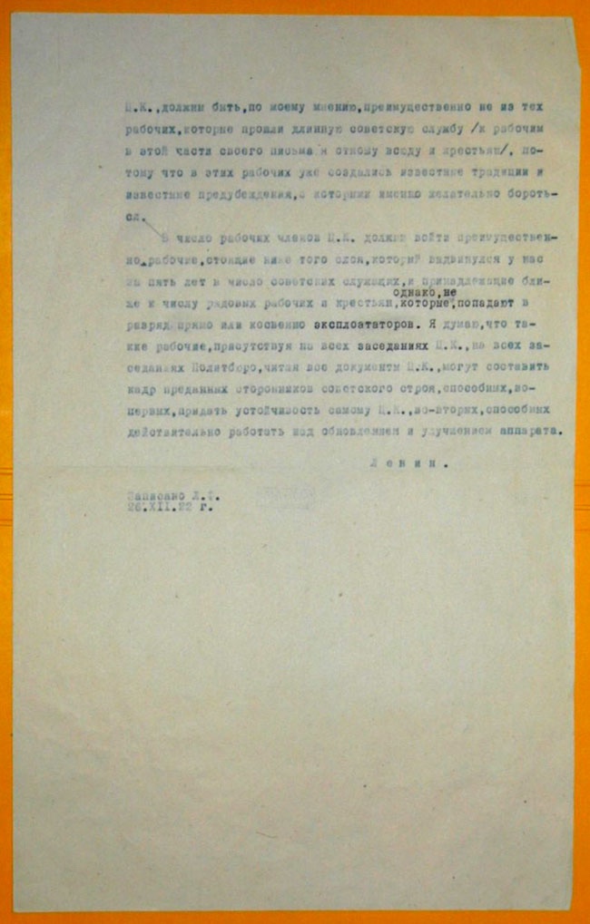 Am 24. Dezember 1922 beschloß das Politbüro, Lenin gegenüber allen politischen Nachrichten abzuschirmen, am nächsten Tag diktierte Lenin einen Brief an den Parteitag, der den Parteitag jedoch nie erreichte, im Westen bald als Lenins politisches Testament rekonstruiert, aber erst von Chruschtschow in der berühmten „Geheimrede“ auf dem XX.Parteitag 1956 bekanntgemacht wurde: