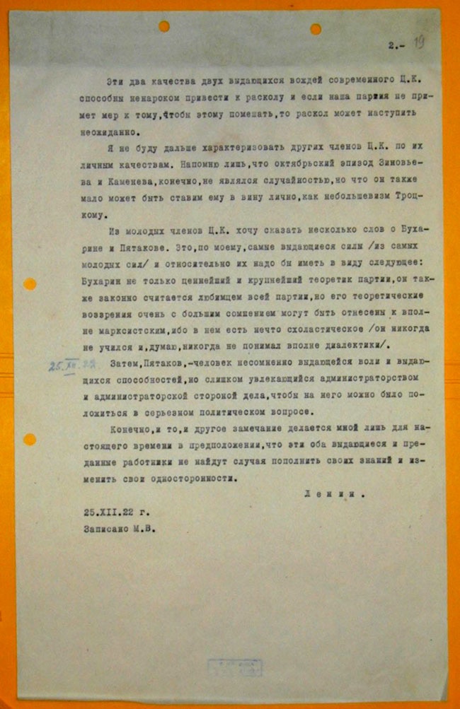 »Genosse Stalin hat dadurch, daß er Generalsekretär geworden ist, eine unermeßliche Macht in seinen Händen konzentriert, und ich bin nicht überzeugt, daß er es immer verstehen wird, vorsichtig genug davon Gebrauch zu machen.«