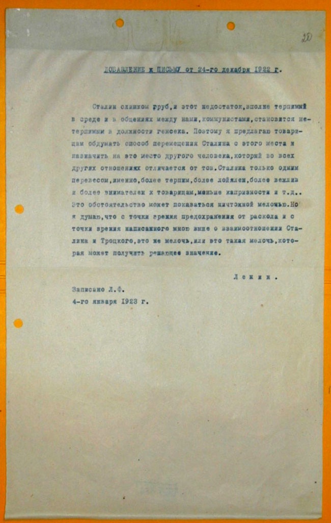 »Stalin ist zu grob, und dieser Fehler, der unter uns und in den Beziehungen zwischen den Kommunisten durchaus zu dulden ist, kann in der Funktion des Generalsekretärs nicht geduldet werden. Deshalb schlage ich den Genossen vor, sich zu überlegen, wie man Stalin versetzen könnte, und jemand anderen an seine Stelle zu setzen …«