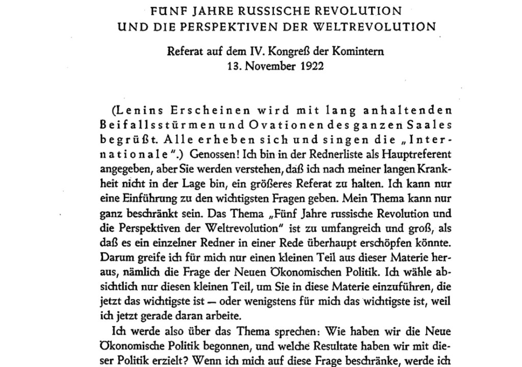 W. I. Lenin, Zum vierten Jahrestag der Oktoberrevolution, in: Lenin, Werke, Band 33, Dietz Verlag, Berlin 1962, Seite 31 ff. Lenins Artikel wurde seinerzeit in der Prawda, Nr. 234, 18. Oktober 1921 veröffentlicht.