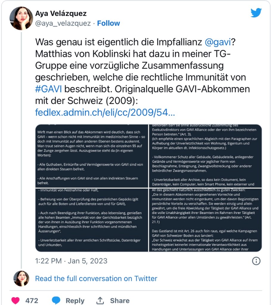 – Alle Stiftungsratsmitglieder und hohen Beamten von GAVI genießen vollständige Immunität vor der Gerichtsbarkeit und den Vollstreckungsbehörden der Schweiz, d. h.: