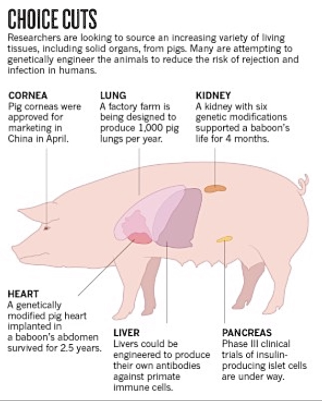 Das macht Schweine sehr interessant für die Medizin und pharmazeutische Forschung. Wir können Schweinherzklappen und sogar ganze Schweineherzen in Menschen einpflanzen und sie werden seltener vom Immunsystem abgestoßen. Das geht mit keinem anderen Tier. Laboranten sind sogar schon so weit gegangen, einen Embryo eines Schwein-Mensch-Hybriden zu schaffen. Ihre Organe sind so angeordnet wie beim menschlichem Körper und ihr Stoffwechsel ist im Grunde genommen identisch zu dem von Menschen. So sehr, dass bereits Schweine gezüchtet werden, welche Spendeorgane für den Menschen produzieren.