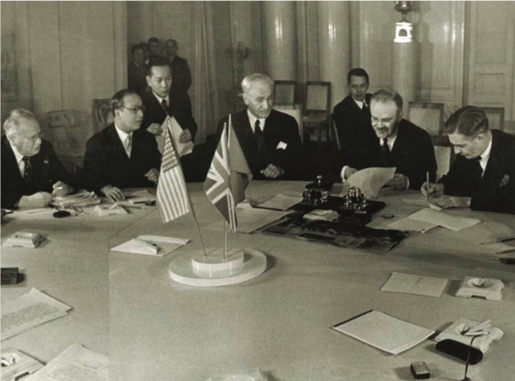 Februar 1945 – Auf der Konferenz von Jalta (Krim) wurde die provisorische Regierung Frankreichs auch eingeladen, zusammen mit den „Big Four“ eine Führungsrolle auf der Konferenz von San Francisco zu übernehmen. Themen der Konferenz waren vor allem die Aufteilung Deutschlands, die Machtverteilung in Europa nach dem Ende des Krieges und der Krieg gegen das Japanische Kaiserreich. Ort der Konferenz war der Liwadija-Palast. Darüber hinaus wurden 46 weitere Länder, die sich im Krieg gegen die Achsenmächte befanden, zur Teilnahme an der Konferenz in San Francisco eingeladen, die offiziell als Gründungskonferenz der Vereinten Nationen bekannt wurde. Ihre Mission war es, die Charta für die Vereinten Nationen im Wesentlichen entlang der Richtlinien zu erstellen, die bei den informellen Gesprächen in Dumbarton Oaks vorgeschlagen wurden.