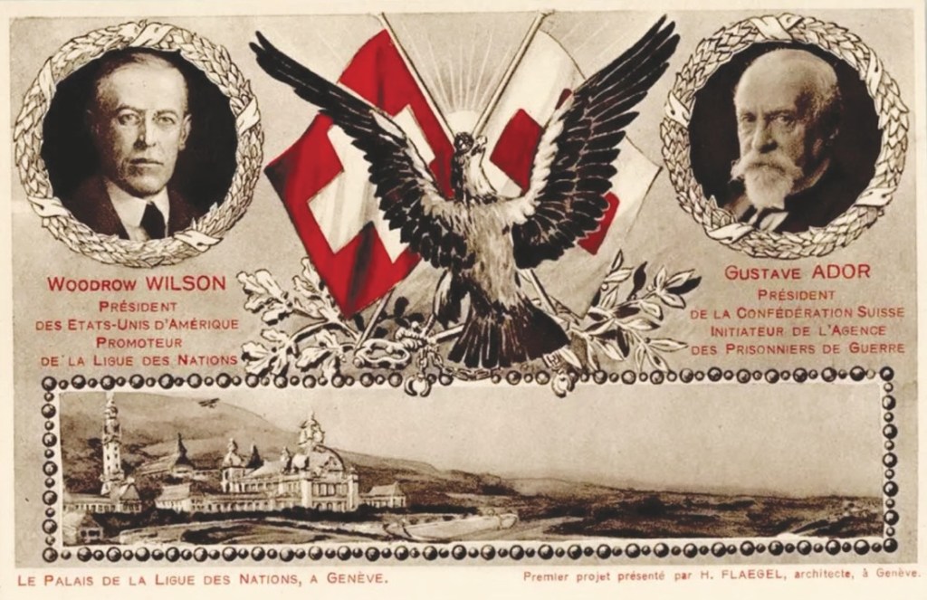 Links US-Präsident Wilson und der Schweizer Präsident Ador, abgebildet die Nationalflagge und die Rotkreuz-Symbolik, die vom Templerkreuz und dem Johanniterordenskreuz wohl unschwer zu trennen ist. Davor der wehrhafte Adler auf einem Eichen- & Olivenzweig und der gepriesene Ort des Geschehens im „Palais de la Ligue des Nations“ in Genf.
